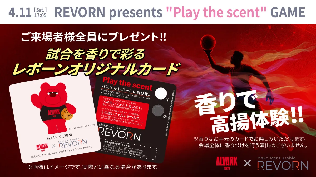 「REVORN presents “Play the scent” GAME」は、アルバルク東京のホームゲーム、島根スサノオマジック戦にて開催されます。2026年4月11日、17:05からTOYOTA ARENA TOKYOで行われるこの試合では、来場者を対象に特別企画があります。ファンから募集した選手への印象を基に、レボーンのAI技術で“選手の香り”を制作し、当日会場で展示します。
