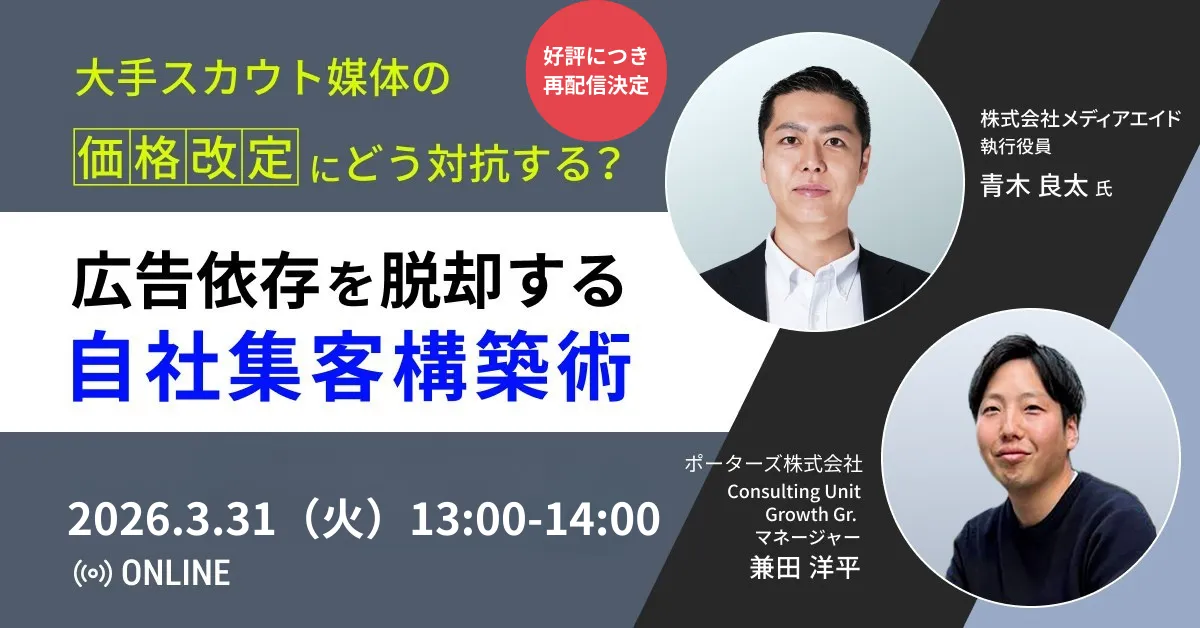 ポーターズ株式会社と株式会社メディアエイドは、この問題に対する解決策をセミナーで提案しました。その名も「大手スカウト媒体の『価格改定』にどう対抗する?広告依存を脱却する自社集客構築術」。このセミナーでは、SNSと自社データを活用した具体的な手法について解説されました。
