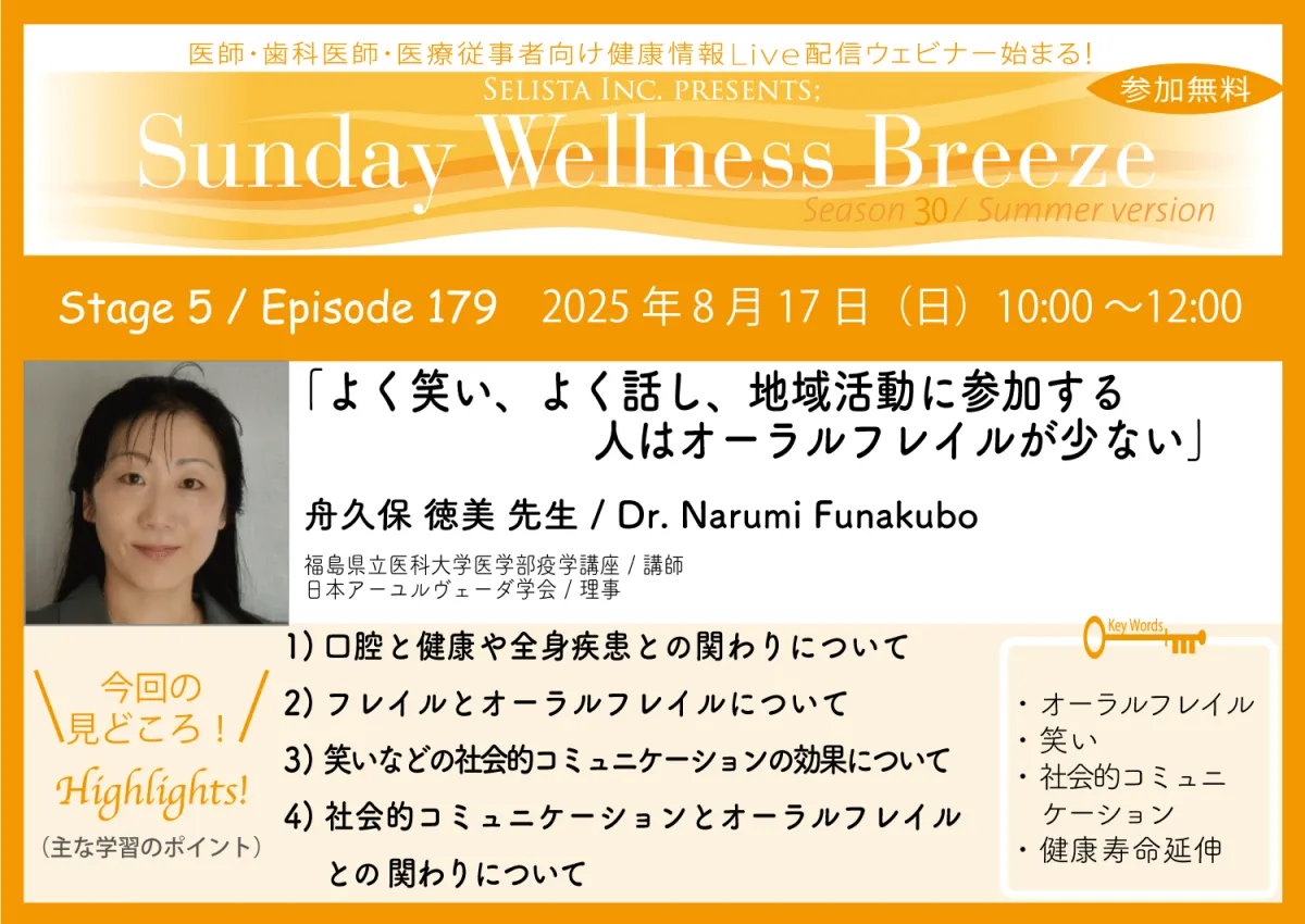 8月17日(日)の朝10時から、医師や歯科医師、薬剤師を対象とした無料のZoomオンラインセミナーが開催されます。このセミナーでは、福島県立医科大学の舟久保徳美先生を講師に迎え、テーマは『よく笑い、よく話し、地域活動に参加する人はオーラルフレイルが少ない』です。