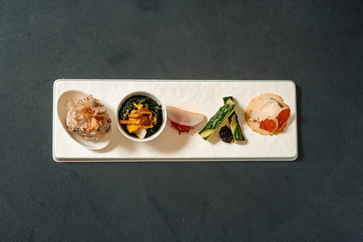 - - 三陸産筋子の大根添え青柚の香りや、気仙沼鰹焼なまり節のポテトサラダによる日本酒と料理の完璧なハーモニー。