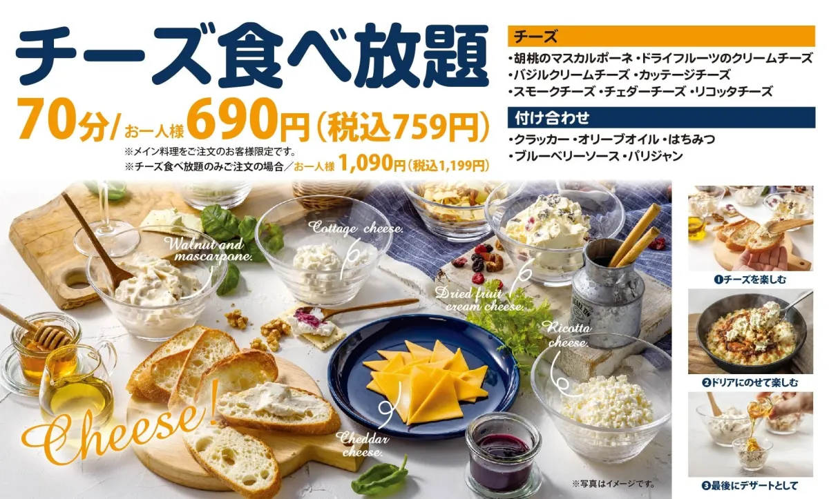 この新しい食べ放題サービスでは、常時7種類のチーズが用意されています。フレッシュなマスカルポーネやカッテージチーズを使い、「ドリアにお好みのチーズをトッピング」したり、「はちみつやブルーベリーソースをかけてデザート風に楽しむ」といったスタイルで、自分だけの楽しみ方を見つけられます。
