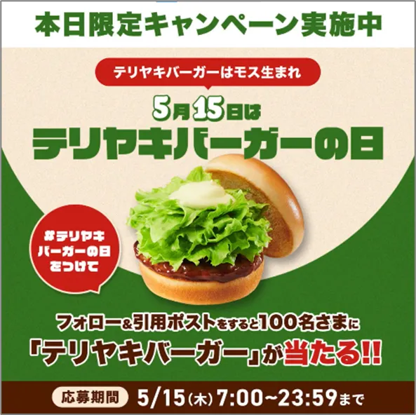 - - 応募方法:モスバーガーの公式Xアカウント(@mos_burger)をフォローし、キャンペーン投稿に「#テリヤキバーガーの日」とコメントを付けて引用ポストします。抽選で100名様に「テリヤキバーガー(1個)」の「ポチッとギフト」が贈られます。