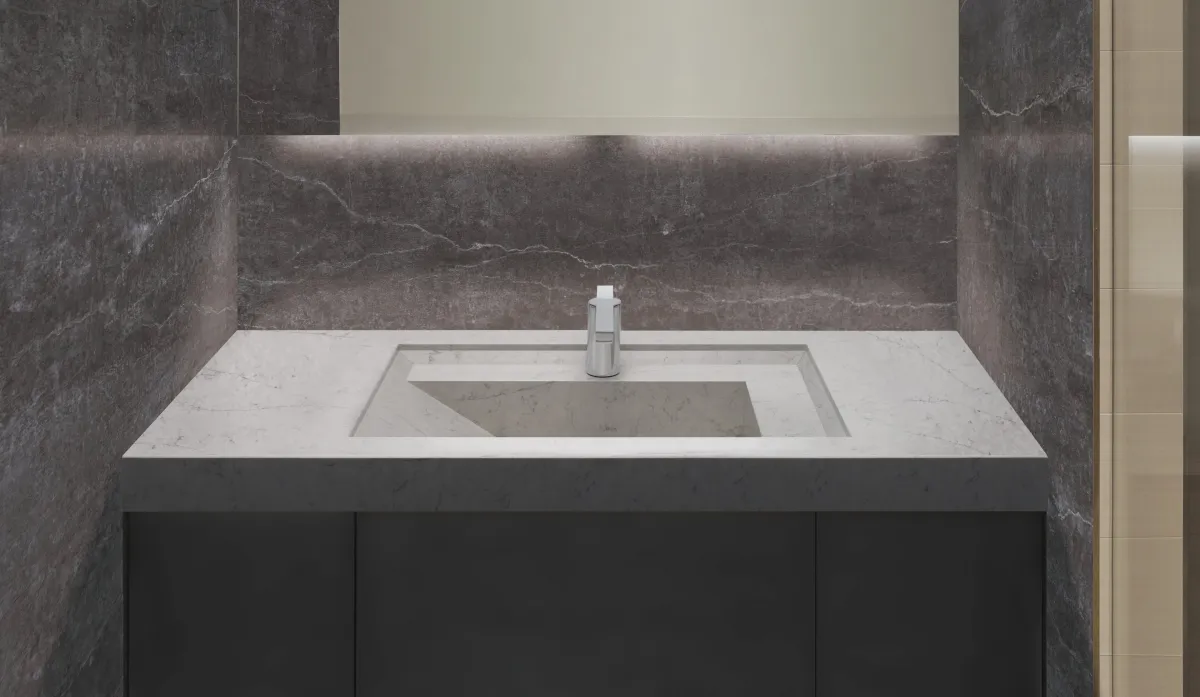 「サイルストーン」は、天然石の美しい外観に加え、優れた耐汚染性と耐久性を兼ね備えた素材です。これにより、日常の使用にも十分耐えられる強靭さを持ちながら、見た目も美しい洗面カウンターを実現しています。「クォーツカウンター」シリーズには、排水金具を隠す工夫が施された排水プレートが標準で装備されています。これにより、スッキリとした印象を与えつつ、デザイン性も保たれています。