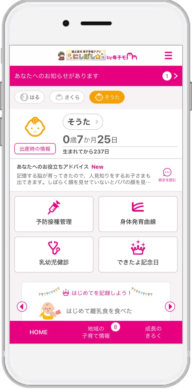 『にしぼし☆』は、妊産婦や子どもの健康データの記録や管理、予防接種スケジュール管理、さらにはトピックスに基づいたアドバイスの提供機能が充実しています。また、家族との情報共有機能や地域の情報をアプリで受け取ることができ、育児や仕事で忙しい親たちの手助けをする仕組みになっています。