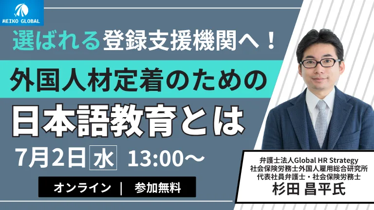 外国籍人材の受け入れがますます広がる中、日本における日本語教育の重要性は日々高まっています。このセミナーでは、最新のアンケート結果を基に、外国籍人材と受入企業の双方が日本語教育を必要としている現状を探ります。また、杉田昌平先生による講演を通じて、登録支援機関が果たす役割や、日本語教育がどのように外国人材の定着を促進するのかについても学ぶことができます。