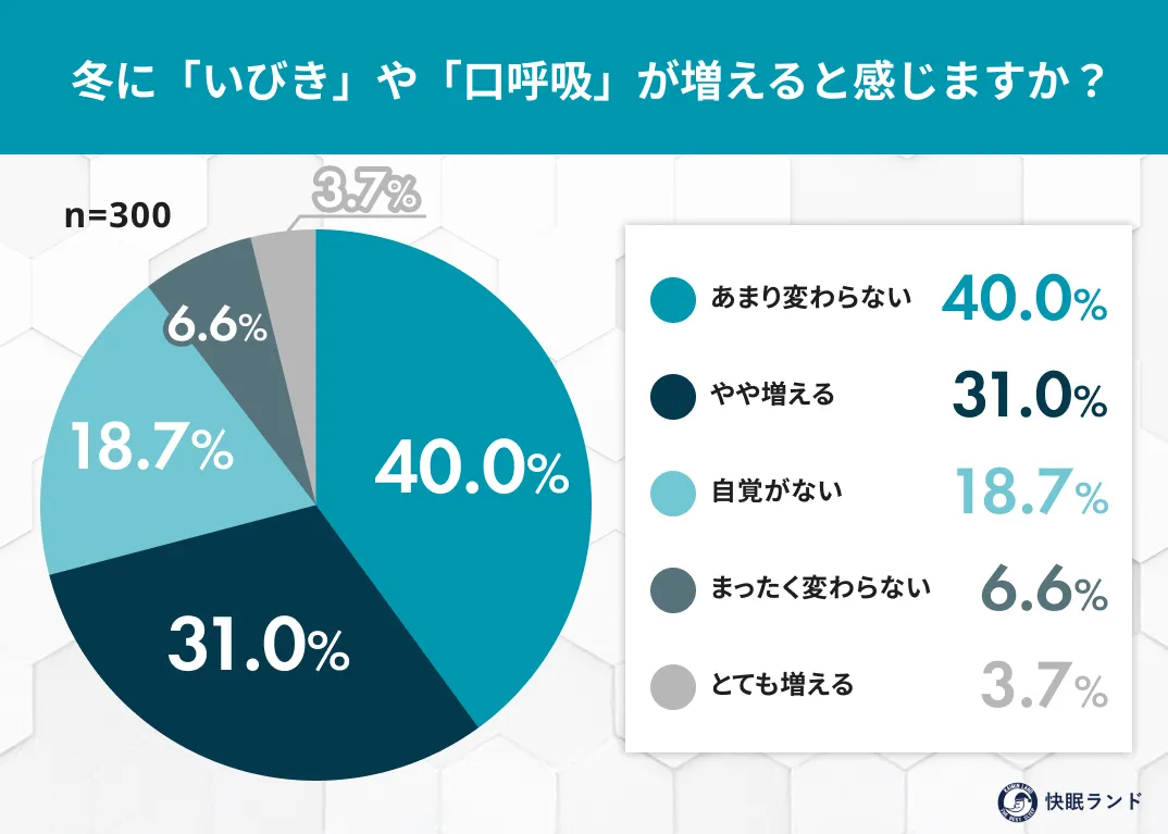 冬になると、気温の低下や空気の乾燥が進み、多くの人々が「いびき」や「口呼吸」に悩まされる季節となります。この時期には、睡眠中の呼吸トラブルが増加することが一般的です。快眠グッズの専門サイト「快眠ランド」を運営するムーンムーン株式会社が行った調査によると、全国の20〜60代の男女300名のうち約34.7%が、冬にいびきや口呼吸が増えると感じていることがわかりました。
