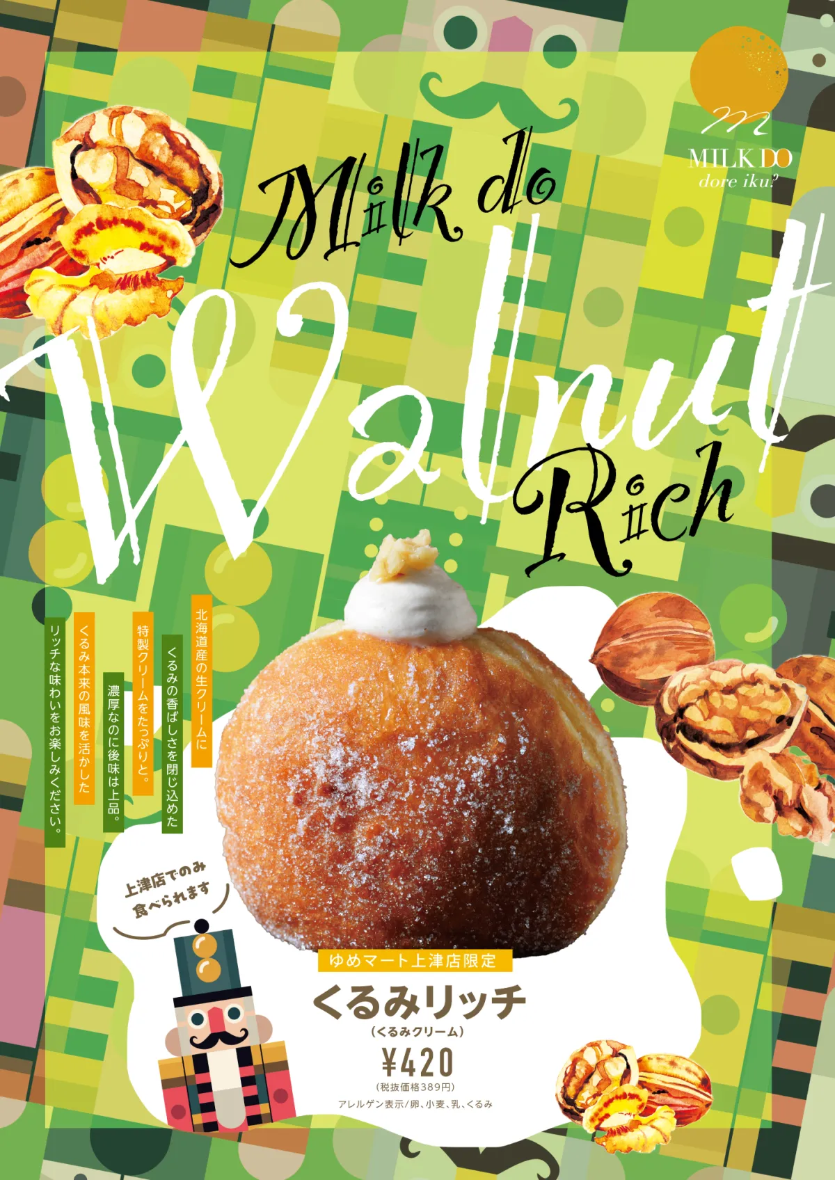 『MILK DO dore iku?』は、根釧地区の生乳を使用した生クリームをふんだんに使ったドーナッツが特徴で、連日大行列ができる人気店。特に、久留米店のオープンにあたり、店舗限定で販売される「くるみリッチ(くるみクリーム)」は、420円で提供されます。このドーナッツは、北海道産の生クリームに香ばしいくるみを加えた特製クリームがたっぷりと詰まっており、濃厚ながらも上品な味わいが楽しめます。