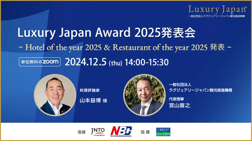 2025年に開催される「Luxury Japan Award」の発表会が、2024年12月5日(木)14時からオンラインで行われることが決まりました。このアワードは、ラグジュアリージャパン観光推進機構が主催し、日本の優れた宿泊施設やレストランを世界中に広めることを目的としています。今年で3回目となるこの賞は、日本の豊かな文化とホスピタリティを世界にアピールするために設立されました。