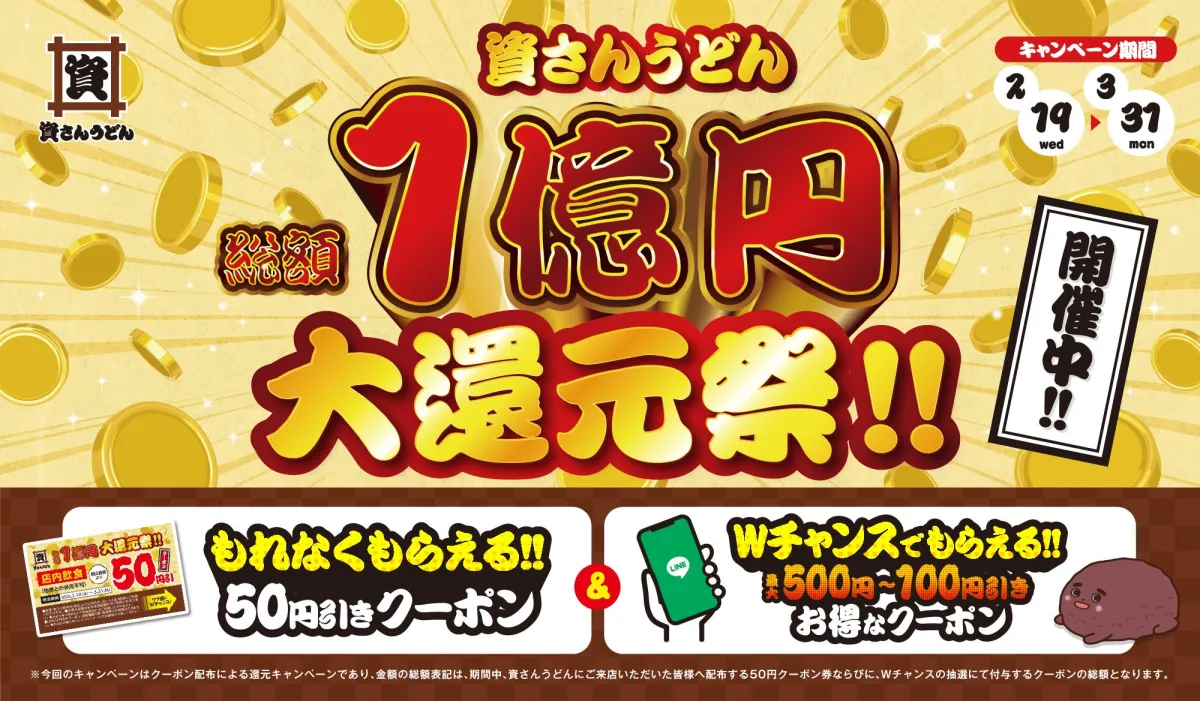 北九州市の名物である「資さんうどん」が、2025年2月19日から3月31日までの間、総額1億円を還元する大イベントを開催します。このイベントでは、来店された全てのお客様に、次回の食事で利用できる50円引きクーポンをプレゼント。また、そのクーポンにQRコードが添付されており、抽選参加をすることでさらに100円から500円のクーポンが当たるチャンスがあります。
