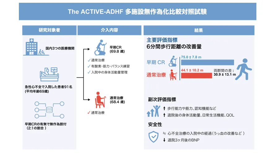 この研究は、2025年6月に米国の心臓病学会誌『JACC: Heart Failure』に発表されたもので、急性心不全の患者に早期に運動療法を導入することで身体機能や生活の質の向上につながる可能性を探りました。この多施設ランダム化比較試験(RCT)は、北里大学病院、北里大学メディカルセンター、亀田総合病院の3か所で行われ、91名の患者が対象となりました。