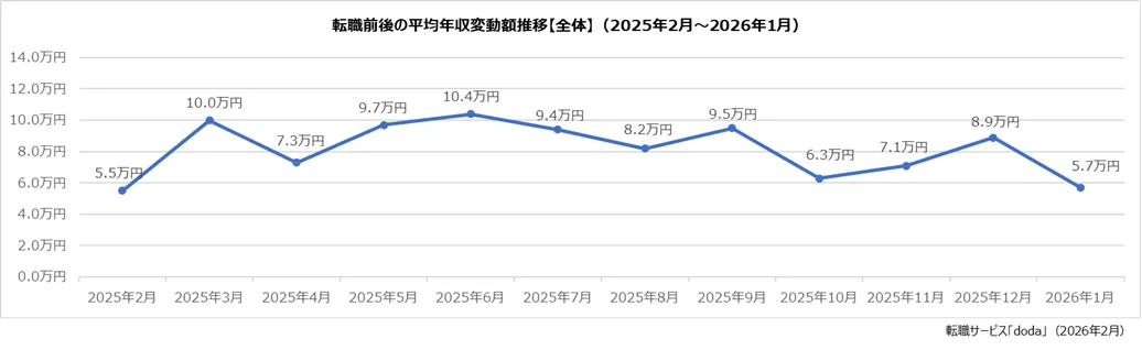 パーソルキャリア株式会社が提供する転職サービス「doda」は、2026年1月に転職を決めた個人の年収変動について調査を行いました。その結果、全体の平均年収は前後で増加を見せたものの、業種や職種による年収増加の差が明らかになりました。このレポートでは、年収変動の具体的な数字とそれに関連する業種や職種の傾向について詳しく解説します。