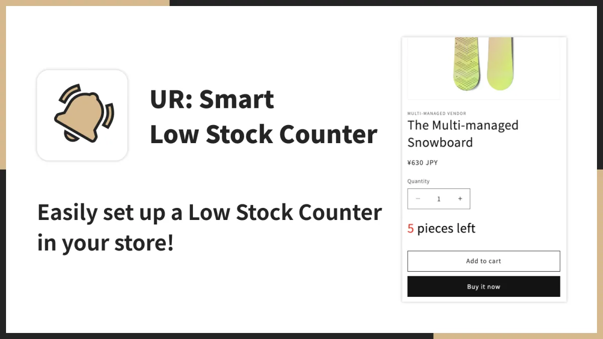 「UR: Smart Low Stock Counter」は、オンラインショップにおいて商品の在庫を視覚的にわかりやすく表示する機能を持っています。特に、在庫が少なくなった際に「残りわずか」と表示することで、顧客に対して購買意欲を喚起させる効果があります。対応言語は英語で、世界中のさまざまなベンダーが簡単に使用できるのも特徴です。