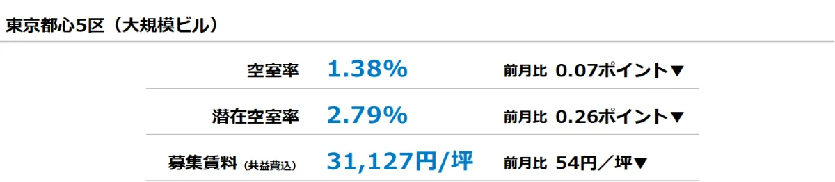 東京都心5区(千代田区、中央区、港区、新宿区、渋谷区)の大規模ビルの空室率は、前月比で0.07ポイント低下し、約1.38%となりました。この下落は、企業の拡張移転や館内増床に伴う空室の消化が進んでいることを表しています。また、潜在空室率も前月比で0.26ポイント低下し、2020年5月以来の2%台となる2.79%を記録しました。これにより、空室率と潜在空室率はともに8ヵ月連続で下落し、低下傾向が持続しています。