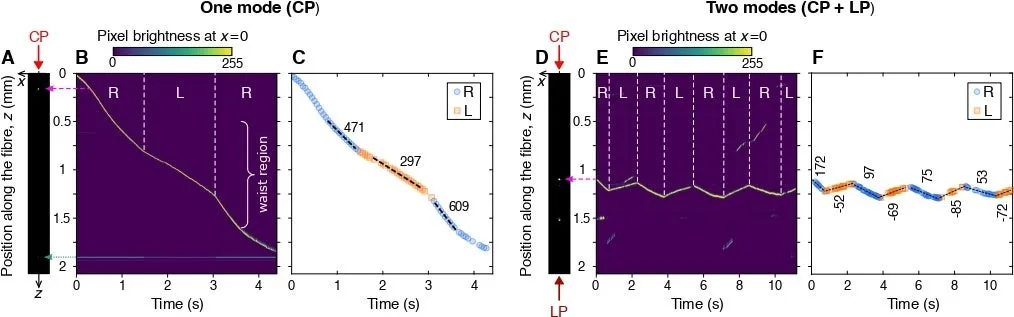 しかし新しい研究では、ナノ光ファイバーの表面から撒き上がるエバネッセント光を活用し、ナノ粒子の運動がファイバーの軸方向に制限されることで効果的に光圧の影響を利用しています。ここでのキーワードは、光の掌性を切り替えることでナノ粒子の輸送速度を変化させることができる点です。測定したデータでは、右円偏光で471 μm/sあった移動速度が、左円偏光に切り替えることで297 µm/sに減少し、再びRCPに戻すと609 µm/sに回復することが確認されています。
