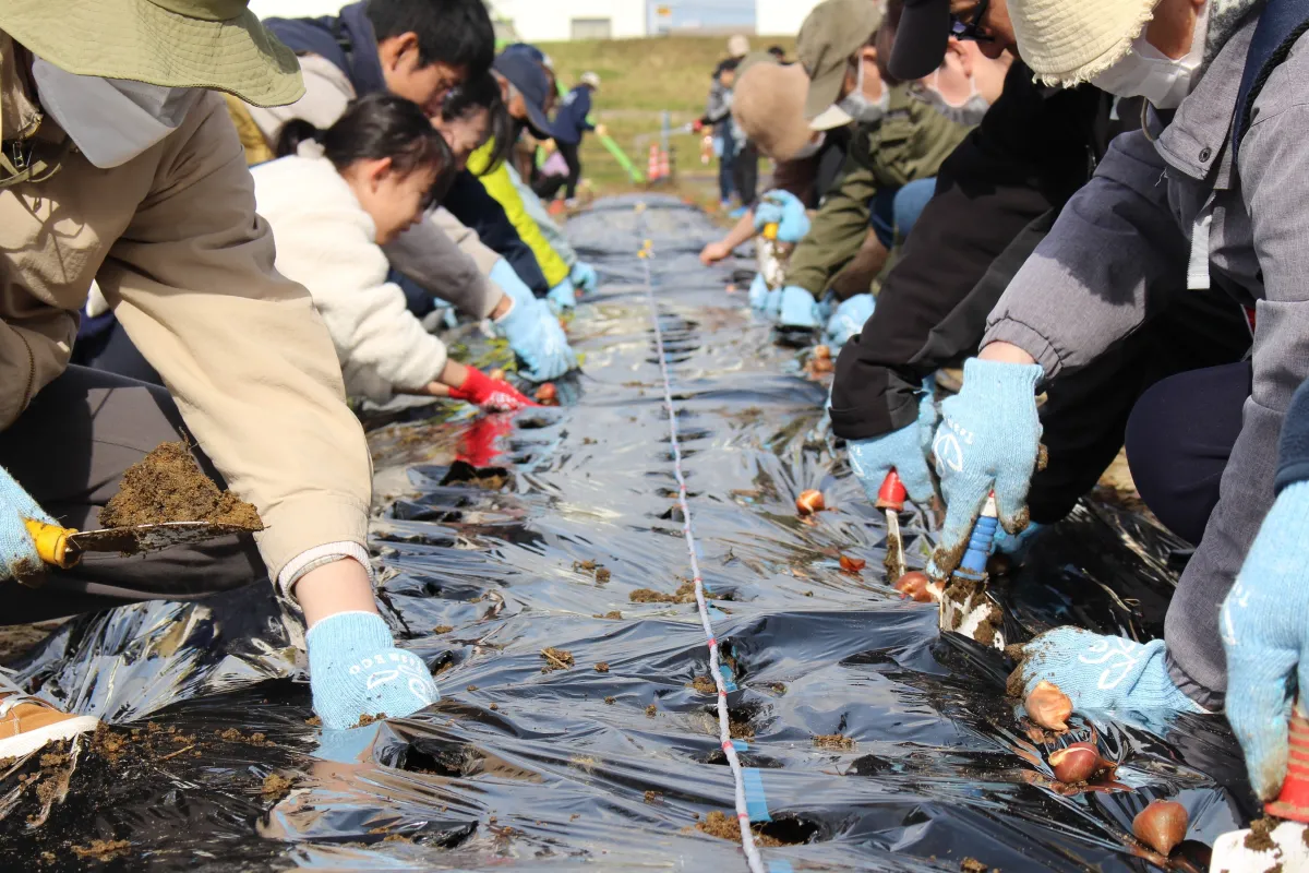 当日は、アークランズのスタッフを含む約80名が集まり、地域の憩いの場であるミズベリング三条で球根の植え付け作業を行いました。これは、緑豊かな地域を作り、次世代に美しい自然を引き継ぐための重要な活動です。
