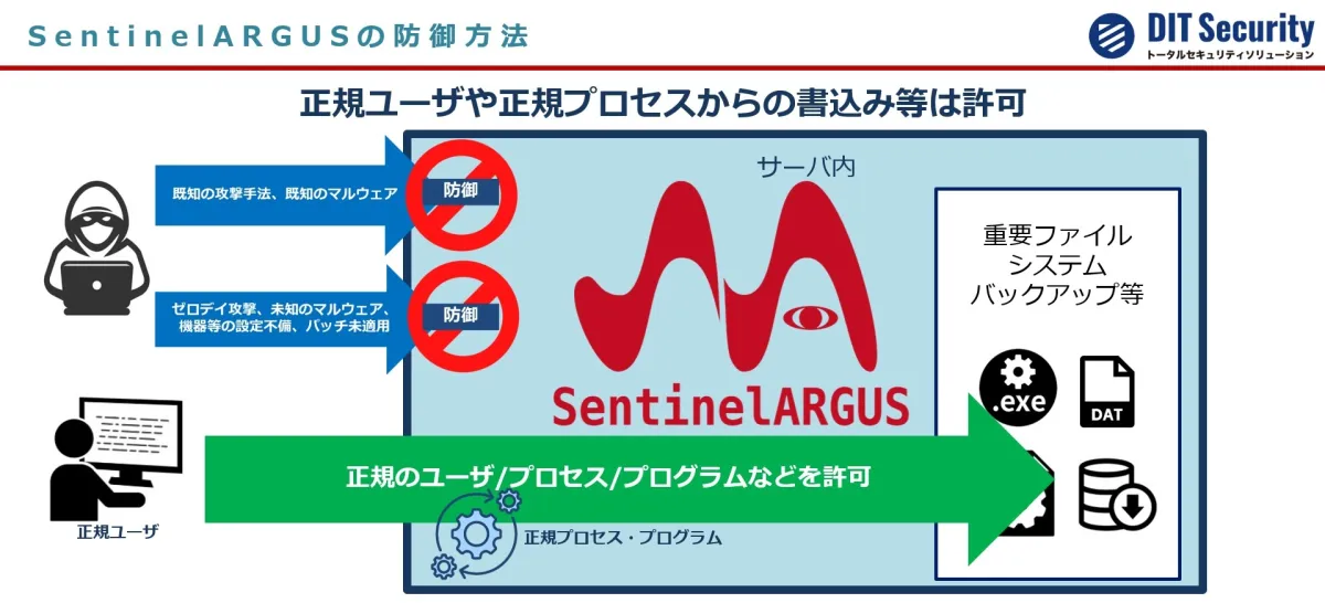 『SentinelARGUS』の名称は「監視者」を意味する「Sentinel」に由来し、その役割を担うべく開発されました。このシステムは許可されたユーザーやプログラム以外からのファイル改変をリアルタイムでブロックします。ランサムウェアの攻撃は、企業データに対する脅威としてますます厳しさを増しており、特にウイルスや不正アクセスからの保護が求められています。具体的な機能として、以下の2点が挙げられます。