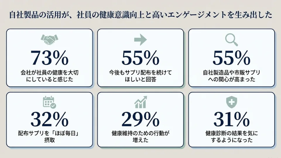 参加した社員からは、「サプリを飲み始めてから体調が良くなった」「健康に対する意識が高まった」という声が寄せられ、サプリメントの効果を実感する社員が多く見られました。特に、自社製品を通じて健康意識が広がったことは、企業文化の醸成にも寄与したと言えます。