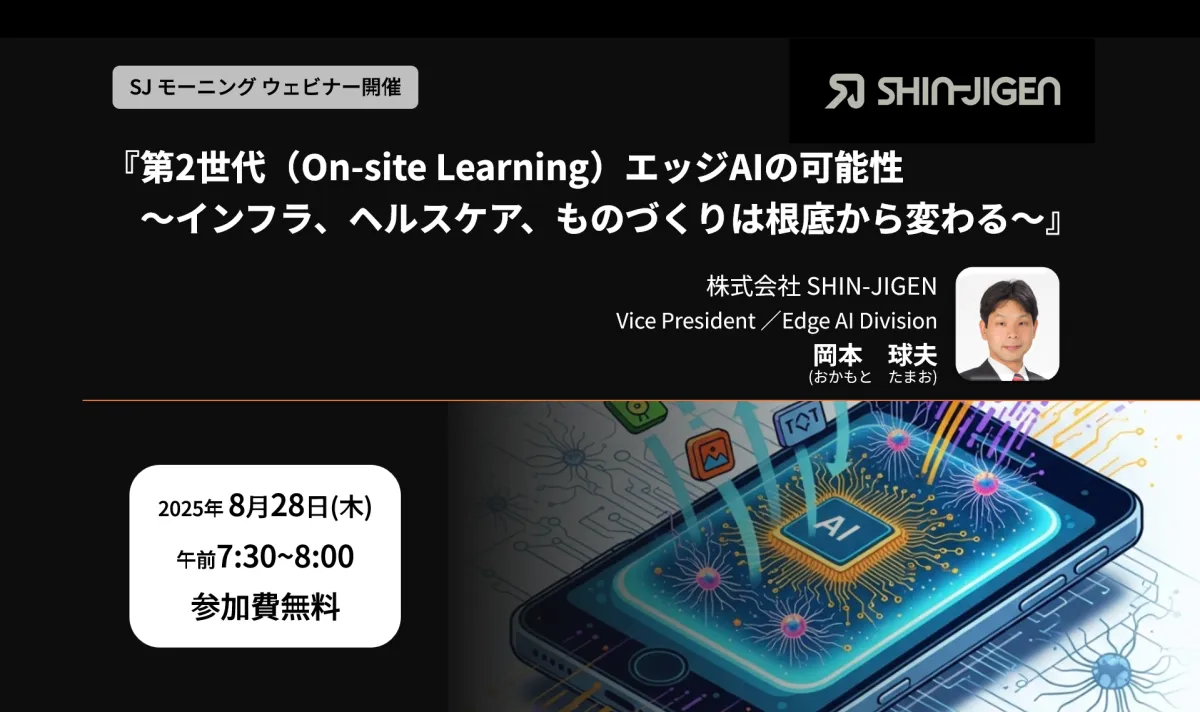 株式会社SHIN-JIGENが主催するウェビナーに注目が集まっています。このウェビナーは、2025年8月28日(木)に開催予定で、テーマは『第2世代(On-site Learning)エッジAIの可能性〜インフラ、ヘルスケア、ものづくりは根底から変わる〜』です。講師を務めるのは同社のバイスプレジデント、岡本球夫氏です。