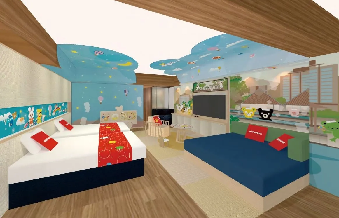 さらに、部屋には「プッチー号」と名付けられたバス型プレイウォールが設置されており、さまざまな遊具が含まれています。大人もリラックスできる空間でありながら、子どもが遊ぶことに集中できる工夫が随所に施されています。これにより、親子での滞在がより楽しいものになることを目指しています。
