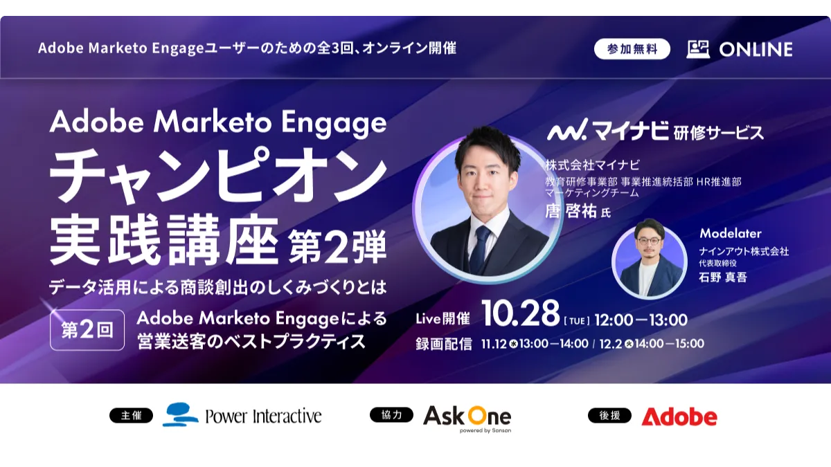 2025年10月28日、株式会社パワー・インタラクティブは、『Adobe Marketo Engageチャンピオン実践講座第2弾:営業送客のベストプラクティス』を開催します。このウェビナーは、3回にわたって行われ、特にAdobe Marketo Engageを活用して営業活動を効率化し、収益に貢献する方法に焦点を当てています。