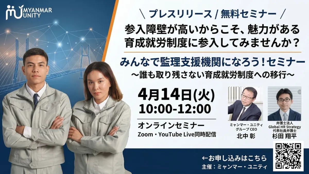 このセミナーは、育成就労制度の詳細を理解したい方や、監理支援機関になりたいが交渉のポイントを知りたい方にとても有益です。日本の少子高齢化に伴う人材不足の解消に向け、ビジネスの幅を広げるために、ぜひご参加を検討してください。