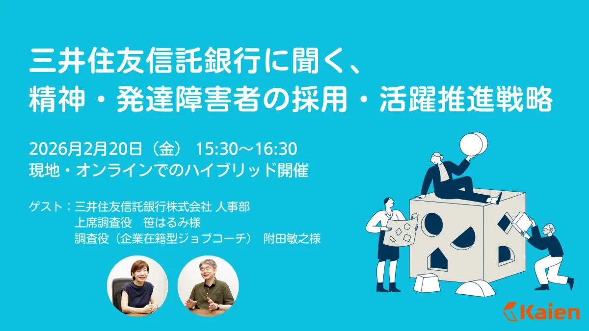 精神障害や発達障害を持つ方への就労支援を専門とする、株式会社Kaienが主催する無料セミナーが2026年2月20日(金)、東京で開催されます。今回のセミナーでは、三井住友信託銀行の人事部から専門家をお招きし、障害者雇用の推進に向けた実践的な戦略を共有していただきます。セミナーはハイブリッド形式で、参加者はオンラインまたは東京都千代田区のKaien秋葉原サテライトで参加可能です。
