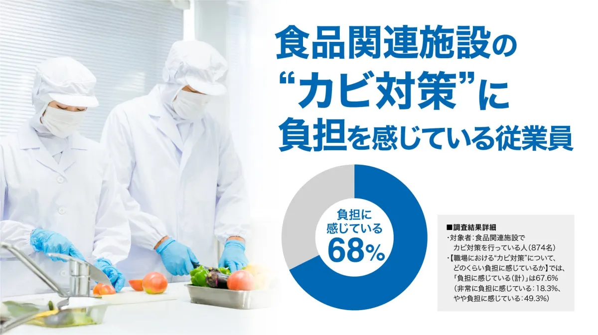 調査では、68%の従業員がカビ対策に「負担を感じている」と回答。特に「作業負担が大きい」「対策の効果が一時的」といった意見が多数を占め、現行の衛生管理が非効率的であることが示唆されました。また、空間全体のカビ対策の難しさや、必要な機器や設備の不足も課題視されています。食品関連施設が直面しているこれらの問題は、効果的な対策を講じることが求められています。