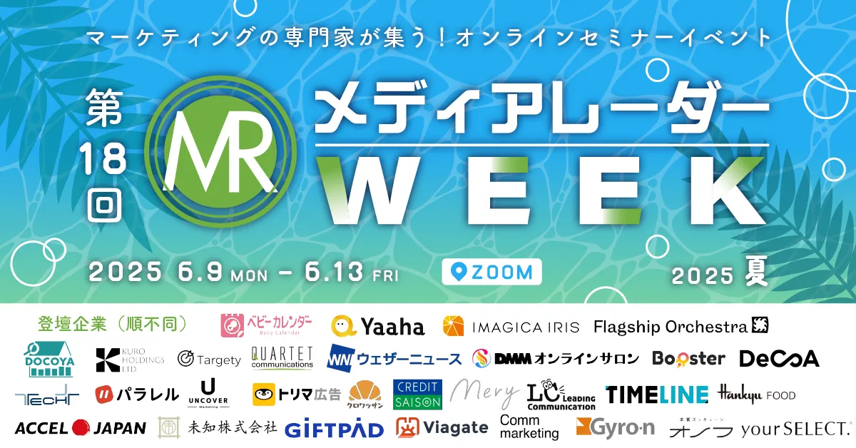 2025年6月9日から13日までの5日間、株式会社アイズが主催する「第18回メディアレーダーWEEK 2025 夏」がオンラインで開催されます。本イベントは、広告業界のプロフェッショナルに向けた大型セミナーで、参加は無料です。今回は、これまでの経験を活かして、さらにパワーアップした内容が予定されています。