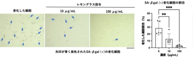 本研究では、老化誘導筋芽細胞とゼブラフィッシュモデルを用いて、レモングラス葉の抗老化作用が確認されました。研究の結果、レモングラス葉のエタノール抽出物が老化細胞に特有の老化関連β-ガラクトシダーゼ(SA-βgal)の発現を抑制することが示されました。このことから、レモングラス葉に筋肉の抗老化作用がある可能性が示唆されました。