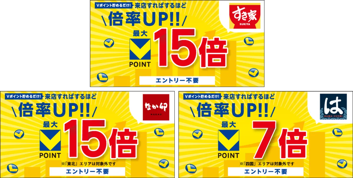 「すき家」と「なか卯」でのキャンペーンでは、来店回数によって最大15倍のVポイントを獲得できます。具体的には、店舗に訪れてモバイルVカードやTカードを提示することで、通常のポイントに加えてキャンペーンポイントが追加される仕組みです。例えば、