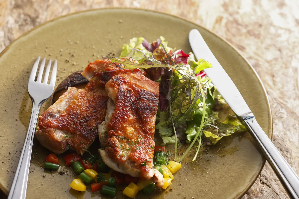 この料理では、山口県の名産である「長州どり」が主役です。長州どりは、きめの細かい肉質と豊かな旨みが特徴で、外は香ばしく、内はジューシーに焼き上げられています。それぞれの食材の持つ力を最大限に引き出し、噛むたびに鶏肉本来の美味しさが広がります。