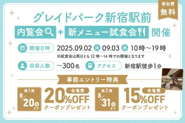 オープンに先駆け、2025年の9月2日と3日には法人様限定の内覧会が行われります。この内覧会では、参加者が自由に会場を見学できるほか、スタッフによる各スペースの案内が行われます。さらに、試食会も設けられており、ビュッフェ形式で新メニューをお楽しみいただけます。試食会は数量限定のため、早めの参加が推奨です。