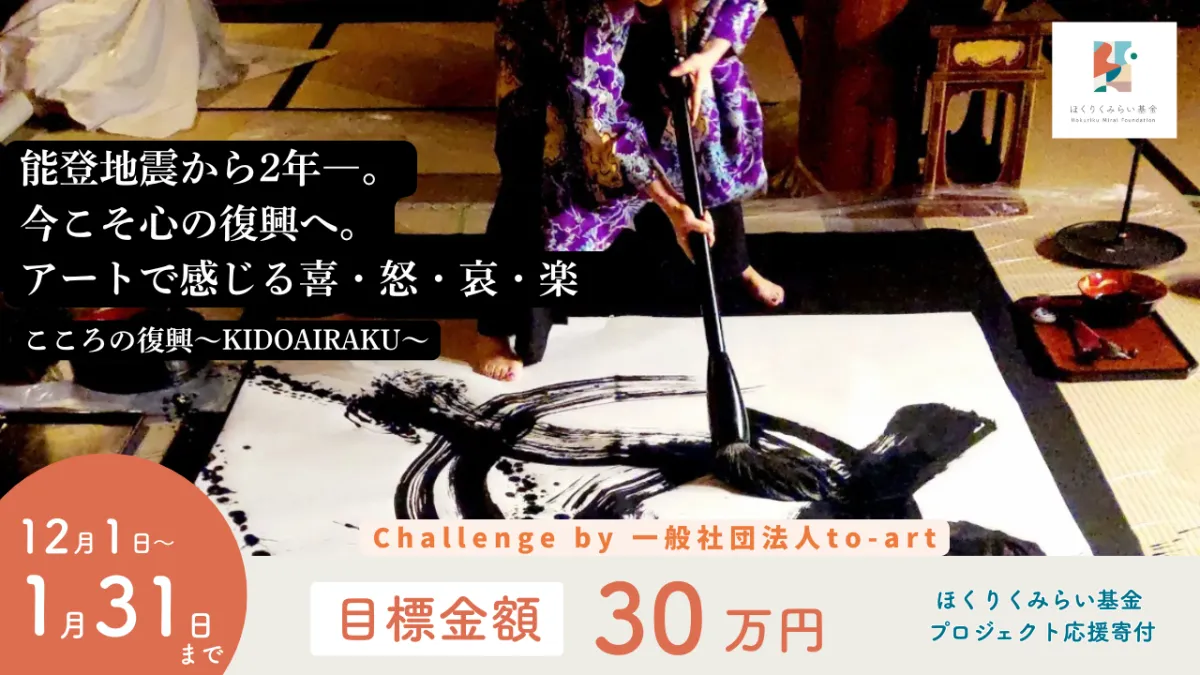 採択されたプロジェクトについて詳しく紹介します。まず、一般社団法人to-artが実施する「喜怒哀楽展」プロジェクトです。このプロジェクトはアートを通じた心の健康と自己表現を支援することを目的としており、心と身体で感じるアートを提供します。2026年の春には、「喜怒哀楽展」と題したイベントが開催されます。このイベントでは、書道パフォーマンスやお坊さんによる絵本の読み聞かせ、音楽、感情に触れ合うワークショップなどが予定されています。これにより、能登の方々の心の復興を後押しすることを目指しています。該当の寄付募集金額は300,000円です。