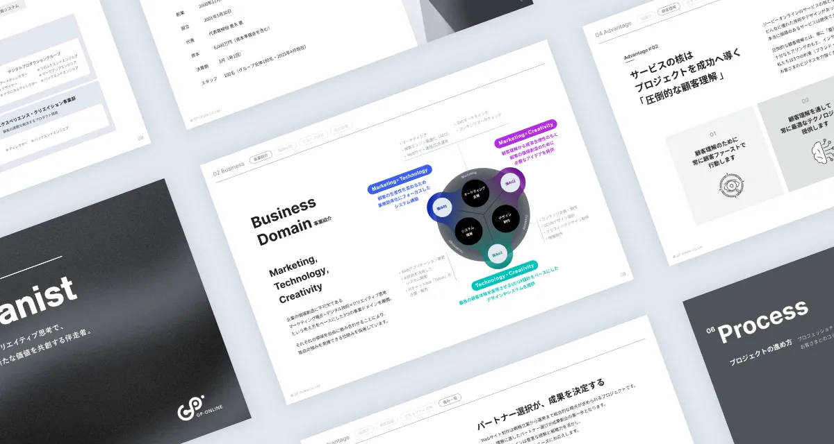 ジーピーオンラインでは、「人とデジタルで“ありがとう”をつくる。」という企業理念のもと、顧客のビジネスに寄り添い、共通のゴールを目指すことを大切にしています。新しい資料では、これまで以上に「伴走者」としての役割を強化し、顧客との信頼関係を築くことを提案しています。