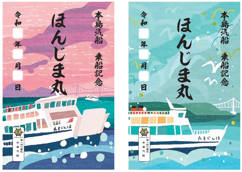 本島汽船が発表した御船印は、旅客船「にじまる」とフェリー「ほんじま丸」の二つの種類からそれぞれ2種類、合計で4種類のデザインが揃います。例えば、旅客船「にじまる」の御船印には、アサギマダラと虹が描かれたものや、瀬戸内海を疾走する「にじまる」の姿があしらわれています。フェリー「ほんじま丸」の御船印には、瀬戸大橋が描かれているものや、穏やかな瀬戸内を航行する姿が特徴です。