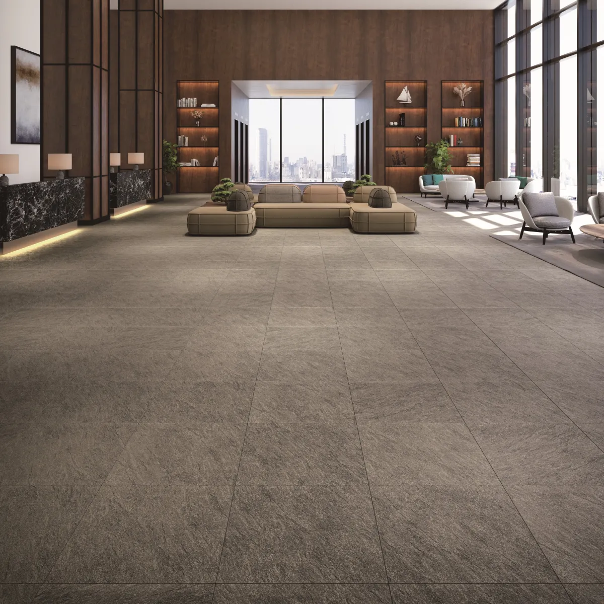 「ORIGIN」の特長の一つは、内外の空間を統合するためのデザインにあります。例えば、マット仕上げのタイルは室内用と外部用で異なるが、同一のデザインで展開されるため、リビングからテラスまでの境界を感じさせない空間を実現することができます。特に、外部用のタイルは十分な防滑性があり、安全性も考慮されています。