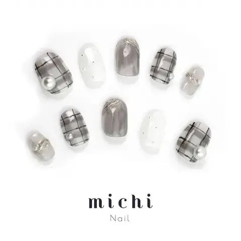 まずご紹介するのは、シアーブラックを基調にしたニュアンスチェックデザインのネイルチップです。このネイルは、洗練された大人可愛いスタイルを実現するために設計されており、シンプルながらも存在感のあるデザインが特徴です。小ぶりのパールとシルバーミラーのアクセントが、上品さと華やかさを見事に両立させていて、様々なシーンで活躍できることでしょう。