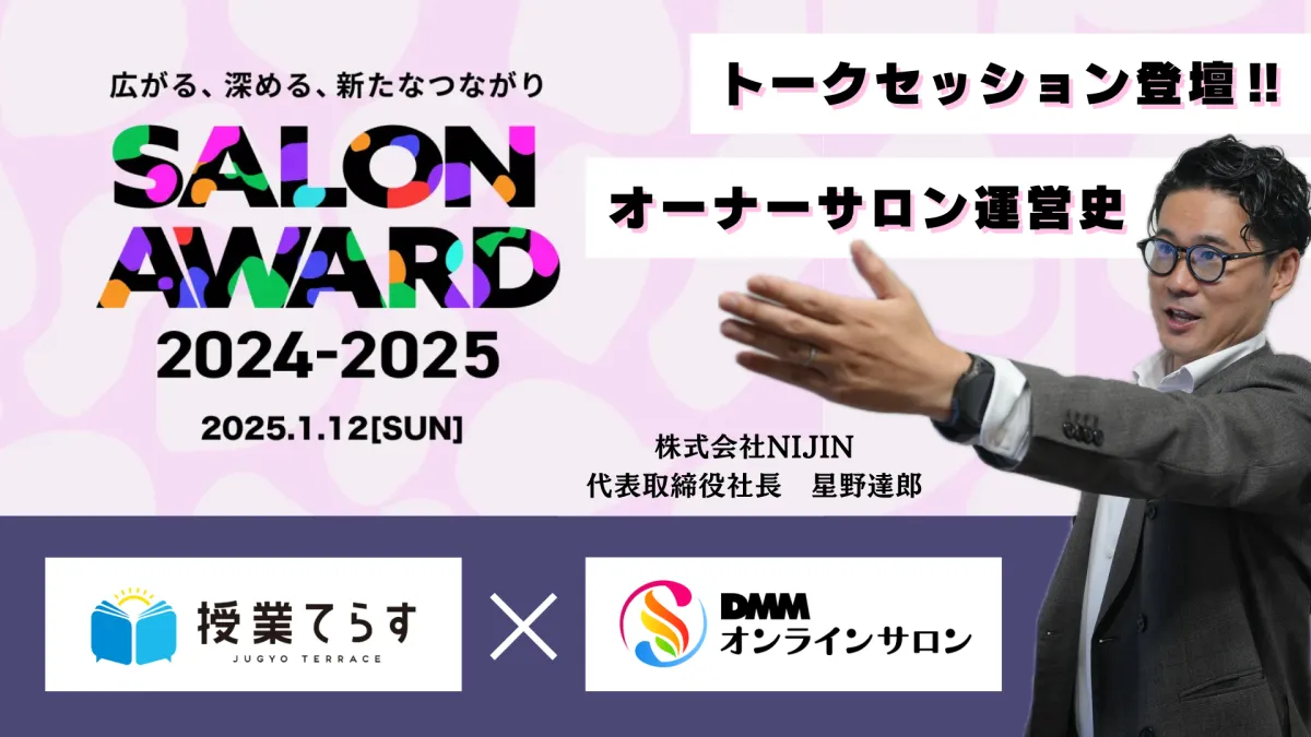 株式会社NIJINの代表取締役である星野達郎氏が、DMMオンラインサロンが主催する「SALON AWARD 2024-2025」に登壇することが決まりました。このイベントは、2025年1月12日にオンラインで開催されます。星野氏は、過去三年間の自身の運営経験をもとに、オンラインサロン「授業てらす」の運営に関する貴重な秘訣をシェアする予定です。