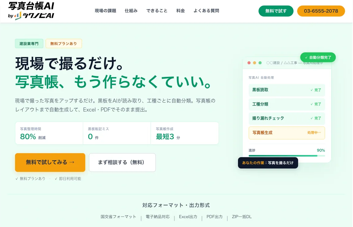 株式会社NITACOが運営する「写真台帳AI」は、建設業界の現場監督にとって大きな助けとなる新しいシステムです。主に工事写真の整理を自動化するこちらのサービスは、写真をアップロードするだけで、AIが黒板に書かれた工事情報を読み取り、瞬時に整理・分類してくれます。