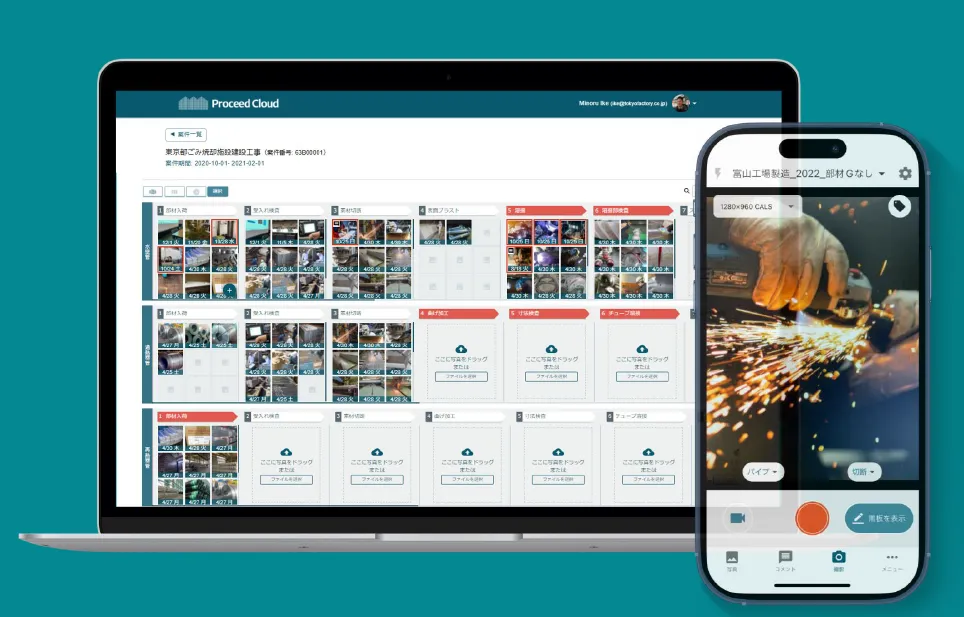 Proceedクラウドは、工事の工程を視覚化することに特化したクラウドサービスです。写真を基にした生産情報のデータベースを構築し、情報の整理・保存を効率化します。これにより、外注先の納期遅延や不良発生リスクを低減することも可能になりました。詳細は公式サイトで確認できます。