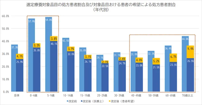 調査の初めに、選定療養化が導入される前後で対象品目の処方状況がどう変わったのかを見ていきます。全体として、選定療養化導入前には37.3%の患者が長期収載品を処方されていましたが、導入後は30.0%と7.3ポイントの減少が確認されました。特に低年齢層の0-4歳や5-9歳においては、15ポイント以上の顕著な減少が見られ、この影響を大きく受けています。これは、選定療養での費用負担が助成金の対象外であるため、患者にとって直接的な負担増加とともに、医療現場においても慎重さが求められることを示唆しています。