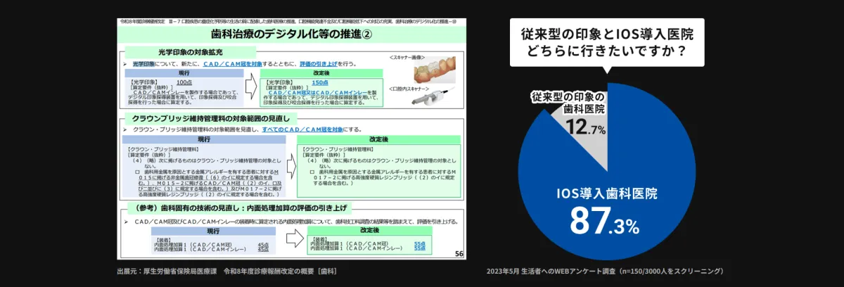 3年後、2026年6月に実施される診療報酬改定で、光学印象(デジタル印象)がCAD/CAM冠の適用拡大に伴い、報酬が1歯につき100点から150点に引き上げられます。この改定により、多くの患者がIOS導入医院を選ぶ動きが加速し、施設にとっては避けて通れない重要な課題となります。しかし、初期投資が数百万に及ぶことが多く、院長たちはそのリスクを躊躇することが多いのが現実です。
