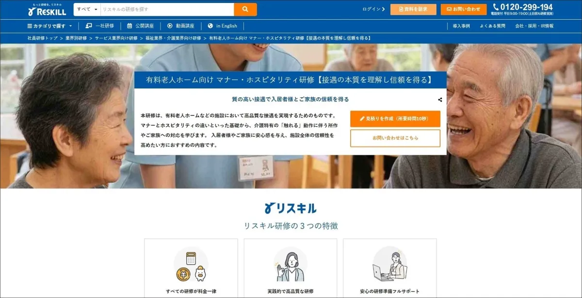 株式会社リスキルは、「もっと研修を」をスローガンに掲げ、業界や職域に対応する柔軟な研修プログラムを提供しています。ホスピタリティ研修を含む多様なビジネス研修を明確な料金で行い、全国的に対応。また、オンラインでの研修やニーズに応じたカスタマイズも追加料金なしで対処しています。研修を通じて、さらに質の高い介護を実現する仕組みを整えていくことを目指しています。