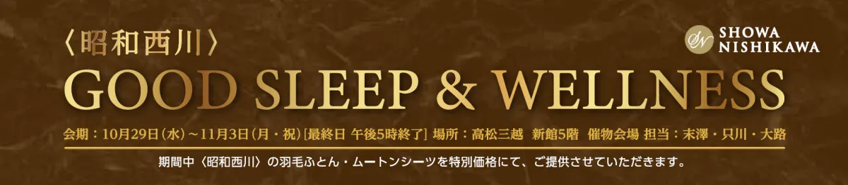 2025年10月29日(水)から11月3日(月・祝)にかけて、高松三越新館5階の催物会場で開催される「GOOD SLEEP&WELLNESS」。このイベントでは、昭和西川株式会社が誇る多様な快眠寝具、ムートンシーツや羽毛ふとん、 MuAtsu(ムアツ)マットレスが展示されます。