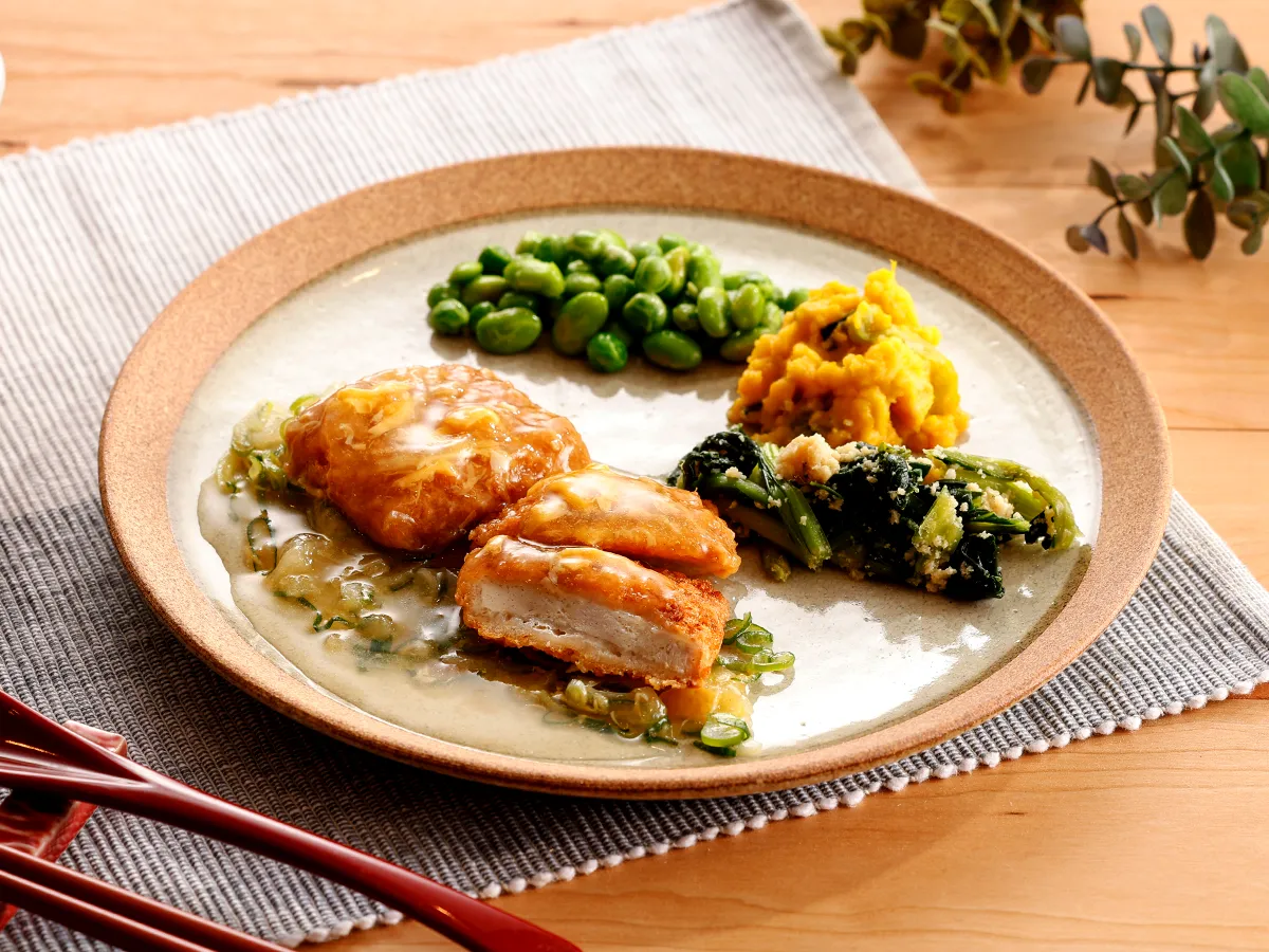 副菜には、高野豆腐のそぼろが入った小松菜のおひたしやバターソースで仕上げたかぼちゃ入りポテト、お豆の生姜あんが付け合わせとして提供され、メイン料理を一層引き立てています。