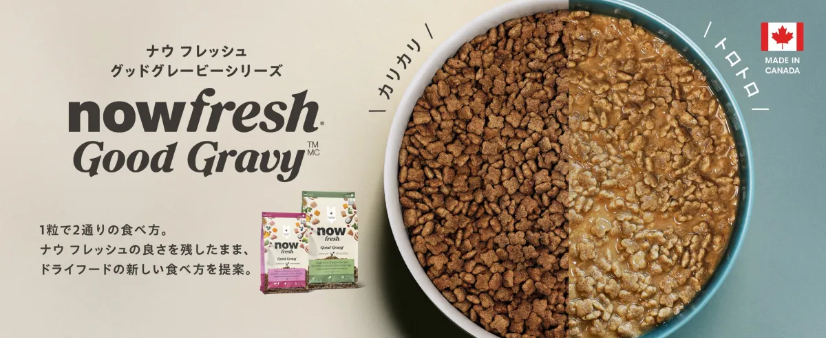 このグッドグレービーシリーズは、従来のNOW FRESHの利点である「ミールフリー」「野菜・フルーツたっぷり」「低温調理」「グレインフリー」の理念を守りつつ、猫が楽しめる新しい食べ方を提案しています。これまでキャットフードを好まなかった猫にも、美味しさをアピールするために、ターキーボーンスープで粒をコーティングしました。粒そのものをそのままドライフードとして与えることもできますし、ふやかしてターキーボーンスープの濃厚な風味を引き出すことも可能です。