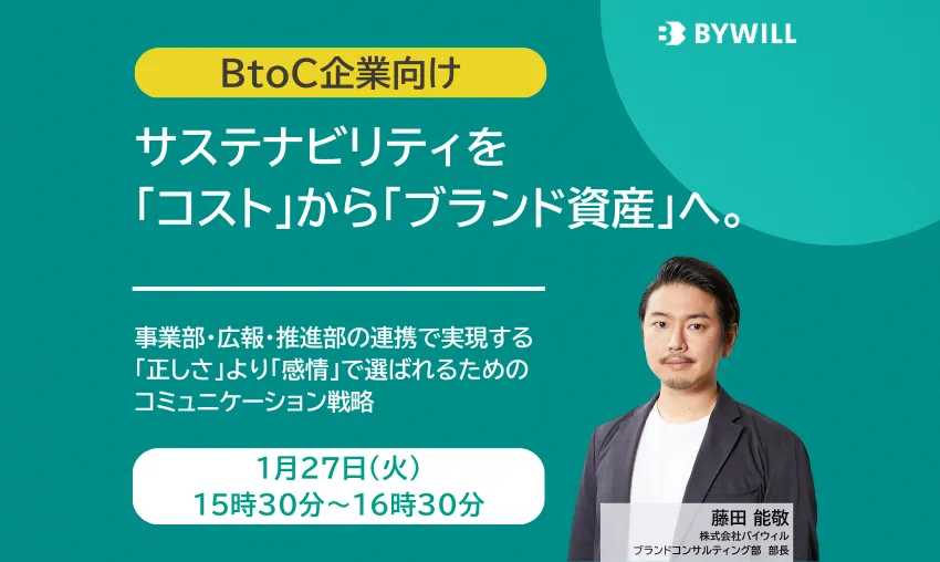2026年1月27日(火)に、株式会社バイウィルが主催する無料のオンラインセミナーが開催されます。セミナーのテーマは「サステナビリティを『コスト』から『ブランド資産』へ。」です。近年、多くの企業がサステナビリティ活動を通じて新たな市場価値を創出しようとしています。このセミナーでは、その具体的な戦略と方法論を学ぶことができます。