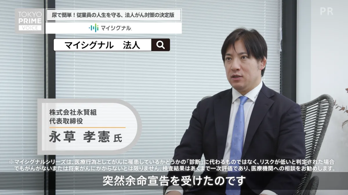 7月14日から始まる広告プロジェクトでは、株式会社永賢組の代表取締役である永草孝憲氏が出演し、全社員にマイシグナルを導入した際の想いを語ります。永草氏は、がんで家族や社員を失ったという辛い経験から、従業員の健康を守る取り組みに本気で関わっています。このような実体験をもとに、企業としてのがん対策導入がどれだけ重要かを伝える内容となっています。