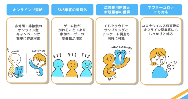 新型コロナウイルスの影響で多くの企業や個人が集客に悩む中、手軽に導入できるオンライン抽選・懸賞システム「くじクラウド」が登場しました。企業の集客方法が変わりつつある今、特に注目のシステムです。