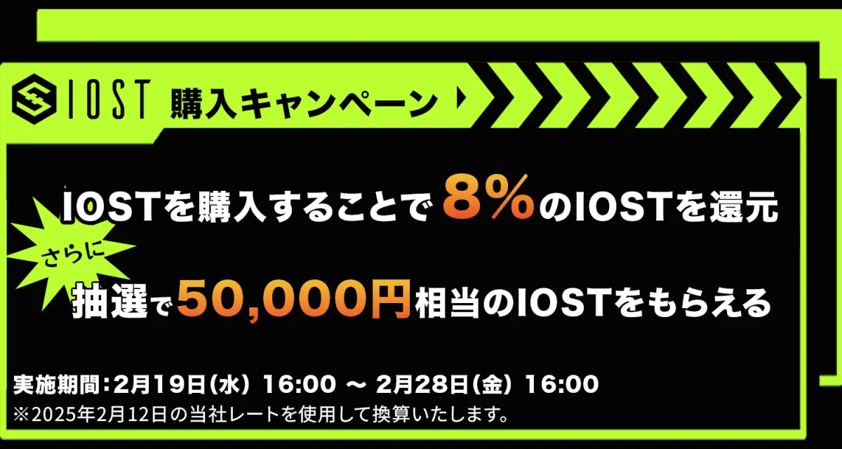 キャンペーンは2025年2月19日(水)から2025年2月28日(金)までの間、IOSTを1万円以上購入した方を対象に、購入金額の8%相当のIOSTを還元するという内容です。これに加え、キャンペーンの参加者の中から抽選で3名様に、65,000IOST(50,000円相当)をプレゼントするというさらにお得な特典があります。